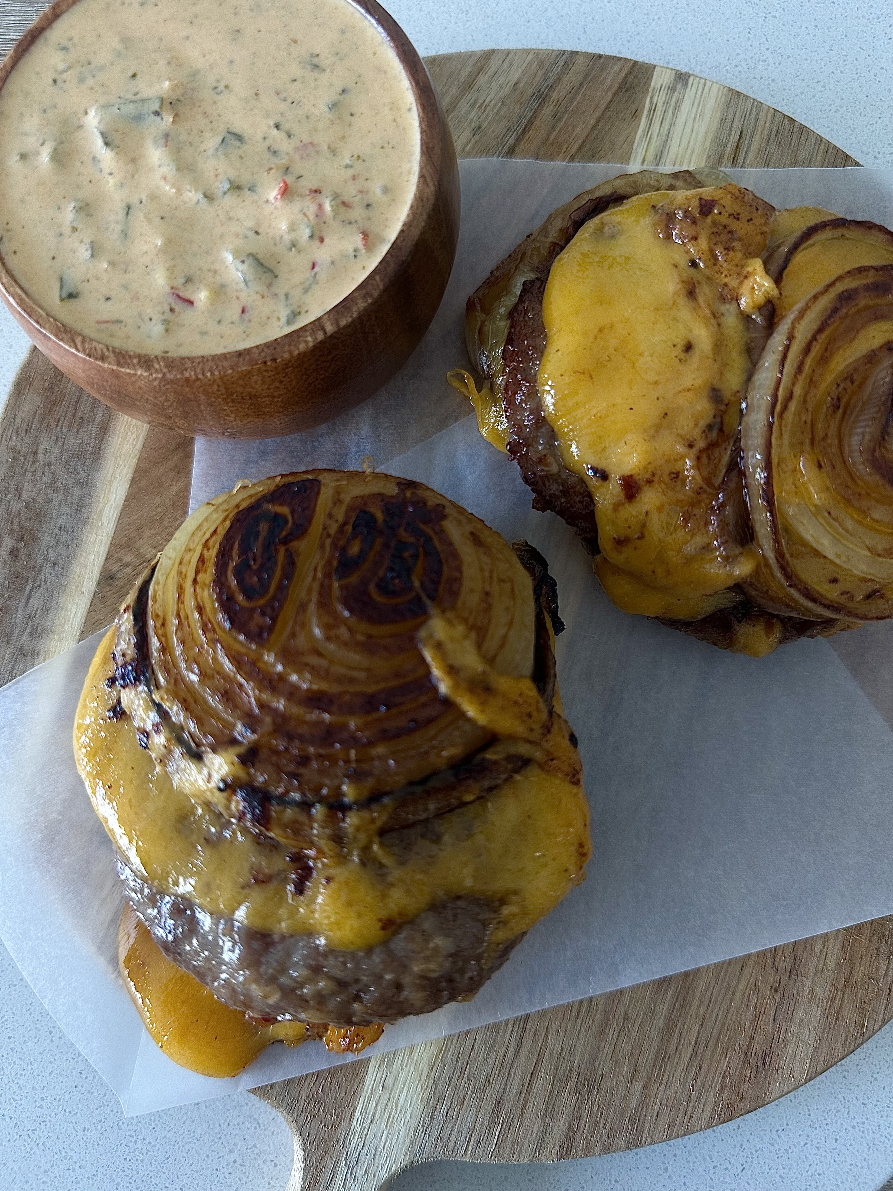 5. Assemble the patties  to create a double burger. Onion, cheese, patty, patty, cheese , onion.