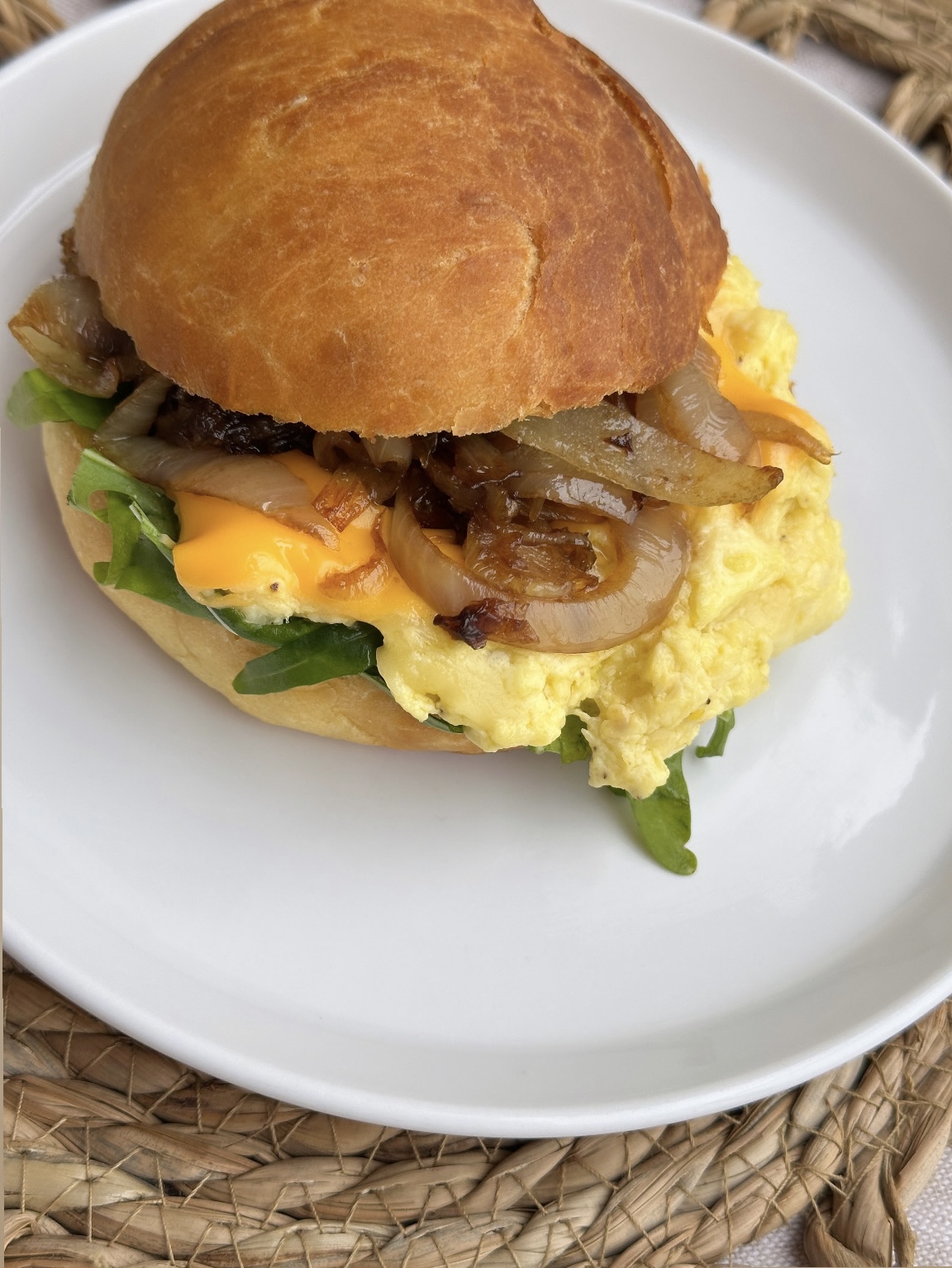 Inside you’ll find fresh rocket, silky scrambled eggs cooked low and slow, a gooey slice of cheese and the real star – sweet, golden caramelised onions.