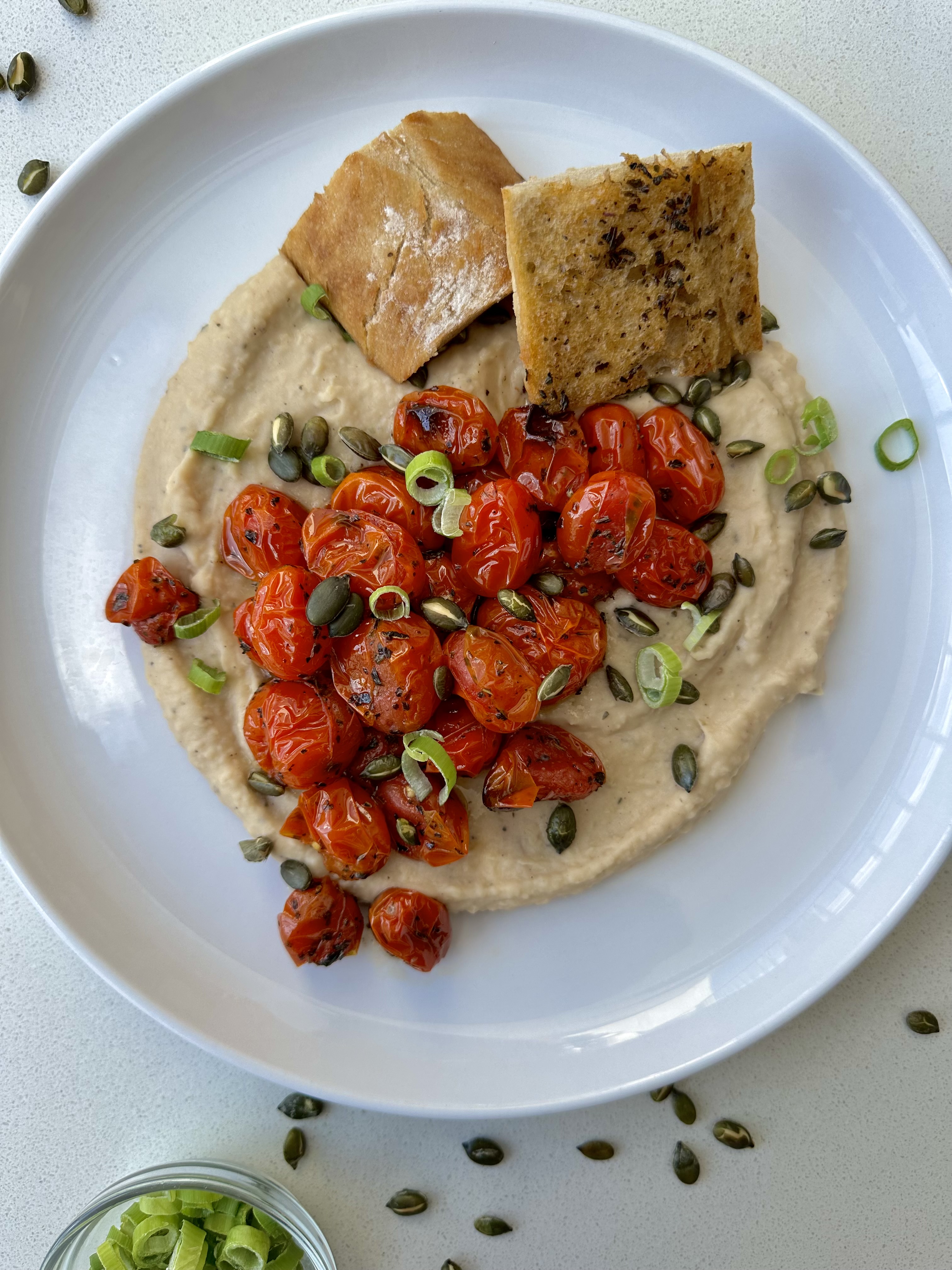 • Place the roasted tomatoes on top of the butter bean dip, garnish with spring onions and roasted pumpkin seeds.